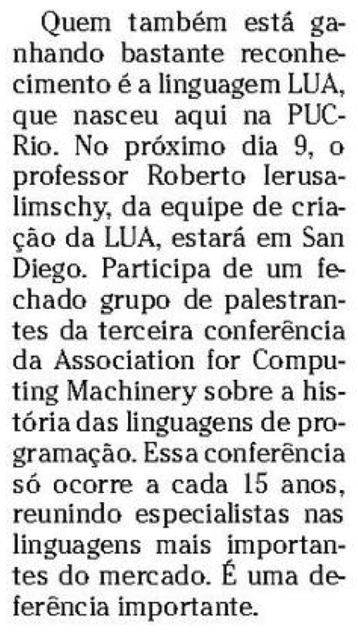 Quem também está ganhando bastante reconhecimento é a linguagem Lua, que nasceu aqui na PUC-Rio. No próximo dia 9, o professor Roberto Ierusalimschy, da equipe de criação da Lua, estará em San Diego. Participa de um fechado grupo de palestrantes da terceira conferência da Association for Computing Machinery sobre a história das linguagens de programação.Essa conferência só ocorre a cada 15 anos, reunindo especialistas nas linguagens mais importantes do mercado. É uma deferência importante.